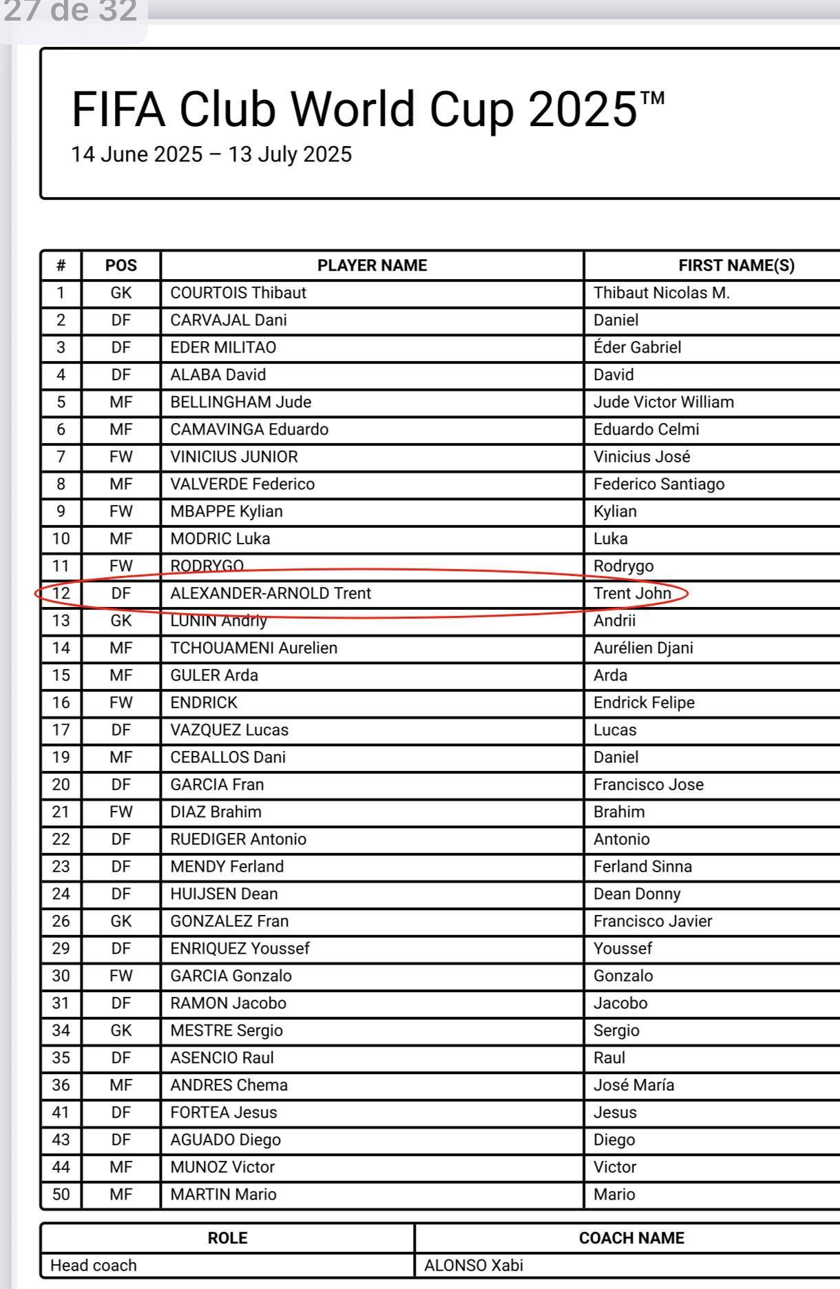 直播吧06月12日讯 世俱杯官方公布各个参赛球队名单,皇马新援阿诺德将身穿12号球衣,而非此前在利物浦一直身穿的66号。